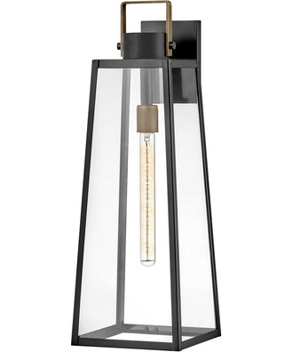 The Hugh 1-Light Large Wall Mount Lantern in Black is a striking addition to any outdoor or indoor space. Its sleek, trapezoidal design features bold, oversized clear glass panes that provide an unobstructed view of the light source, creating a modern and sophisticated look. The black finish on the sturdy aluminum frame adds a touch of elegance and durability, making it a perfect fit for contemporary and transitional decor styles.