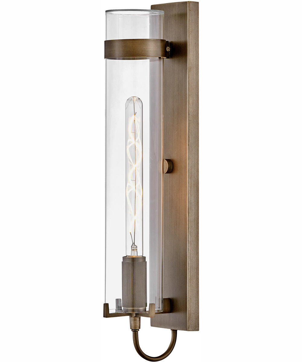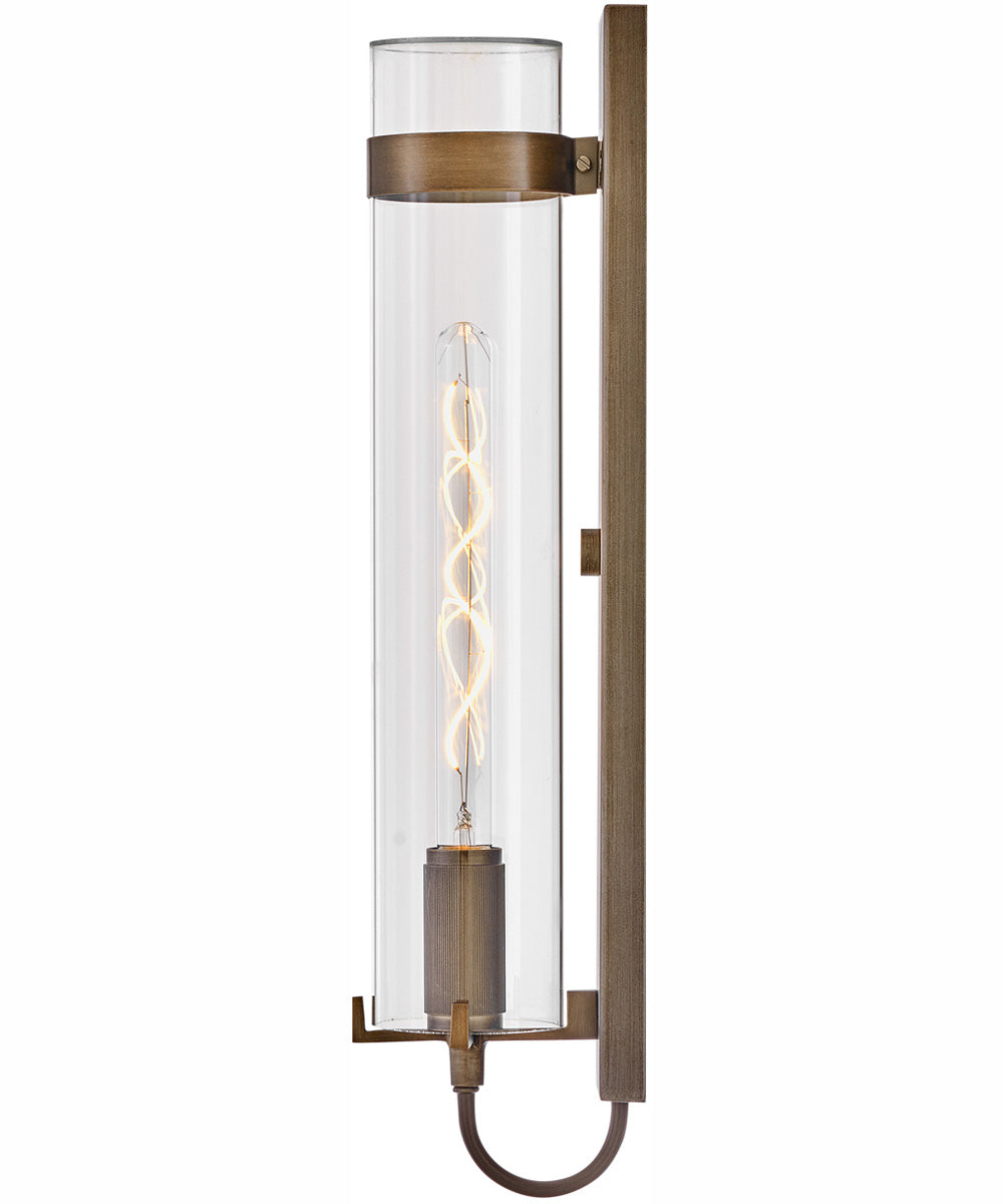 The Ryden 1-Light Large Wall Mount Lantern in Burnished Bronze by Hinkley is a stunning addition to any home or office. This lantern features a sleek, modern design with clean lines and a sophisticated aesthetic. The burnished bronze finish adds a touch of vintage charm, making it a versatile piece that complements both contemporary and traditional decor styles. The cylindrical shape of the lantern, combined with its clear glass enclosure, creates a visually appealing silhouette that enhances the overall ambiance of any space.