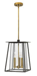 Walker has roots in the American West with its large scale, strong angular lines and no-nonsense style. The sturdy aluminum and brass construction features a two-tone finish of bold Buckeye Bronze and Heritage Brass or Black and Antique Nickel. A welded outer form frames an inner clear, bound glass shade.