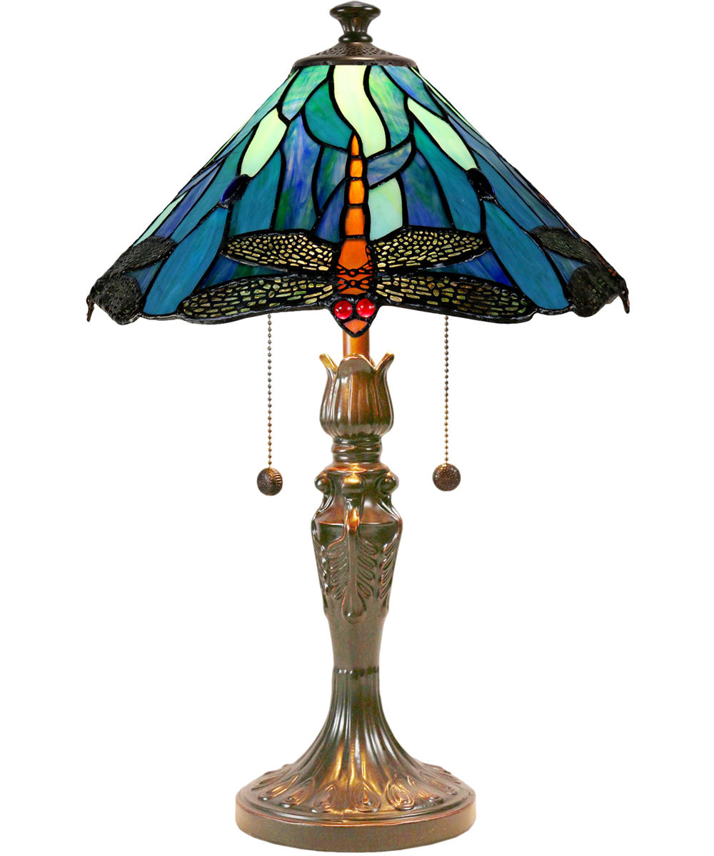 Our Huxley Dragonfly Tiffany Table Lamp features a harmonious balance of tranquil and bright colors to easily accentuate any décor in your home or office. The generously sized cone shade is set in a leaf pattern that begins with greens at the top that give way to muted blue near the bottom. A row of tiffany’s iconic dragonflies run along the bottom of the shade. Each features a bright amber body and filigreed wings, as well as bright red art glass gem eyes that are designed to pop off the shade’s surface when Huxley is illuminated. Each piece of glass Because of this, please allow for subtle variations in color. The beautifully cast base is finished in Antique Bronze and features leaf detailing on both the center column and pedestal as well as a floral candle cup just under the shade. Our Huxley Dragonfly Tiffany Table Lamp is perfect on end tables or nightstands and will provide you with many years of timeless and reliable lighting.