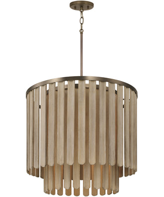 The Jada 5-Light Pendant in Dark Brass is a stunning addition to any home, combining modern organic style with muted earth tones. Handcrafted from mango wood, this pendant light features a Nordic Grey finish that adds a subtly distressed look, enhancing the elegant texture and depth of its tiered form. The dark brass metal frame complements the wood adornments, creating a sophisticated and timeless aesthetic.