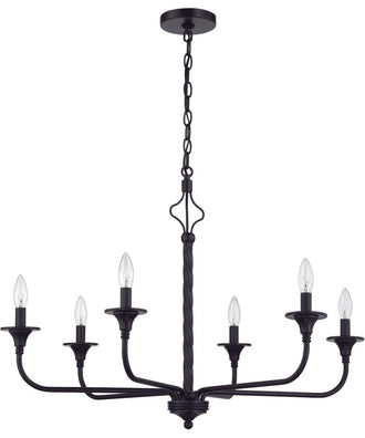 The Jolenne 6-Light Chandelier in Flat Black is a stunning piece from the Craftmade collection, embodying both elegance and functionality. The chandelier features gracefully swirled center columns and slender arms with delicately flared bobeches, creating a mesmerizing silhouette that adds a touch of sophistication to any space. Its flat black finish enhances its modern yet timeless appeal, making it a versatile addition to various room themes.