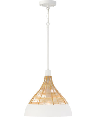 The Kali 1-Light Pendant boasts a unique blend of modern and rustic styles. The 14-inch wide shade is handcrafted from natural rattan, creating a warm, inviting glow when illuminated. The rattan's natural variation adds an element of uniqueness to each piece, ensuring no two pendants are exactly alike. The Matte White finish on the metal components complements the rattan perfectly, offering a clean, neutral tone that fits seamlessly into contemporary decor.