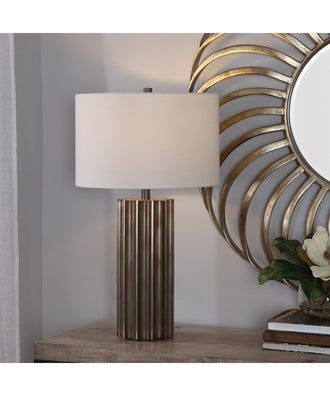 This Table Lamp Features A Deep Fluted Steel Base Finished In An Aged Gunmetal With Rust Distressing And Brass Plated Edges, For A Rustic Industrial Feel. The Round Hardback Drum Shade Is A White Linen Fabric.Uttermost's Lamps Combine Premium Quality Materials With Unique High-style Design.With The Advanced Product Engineering And Packaging Reinforcement, Uttermost Maintains Some Of The Lowest Damage Rates In The Industry. Each Product Is Designed, Manufactured And Packaged With Shipping In Mind.