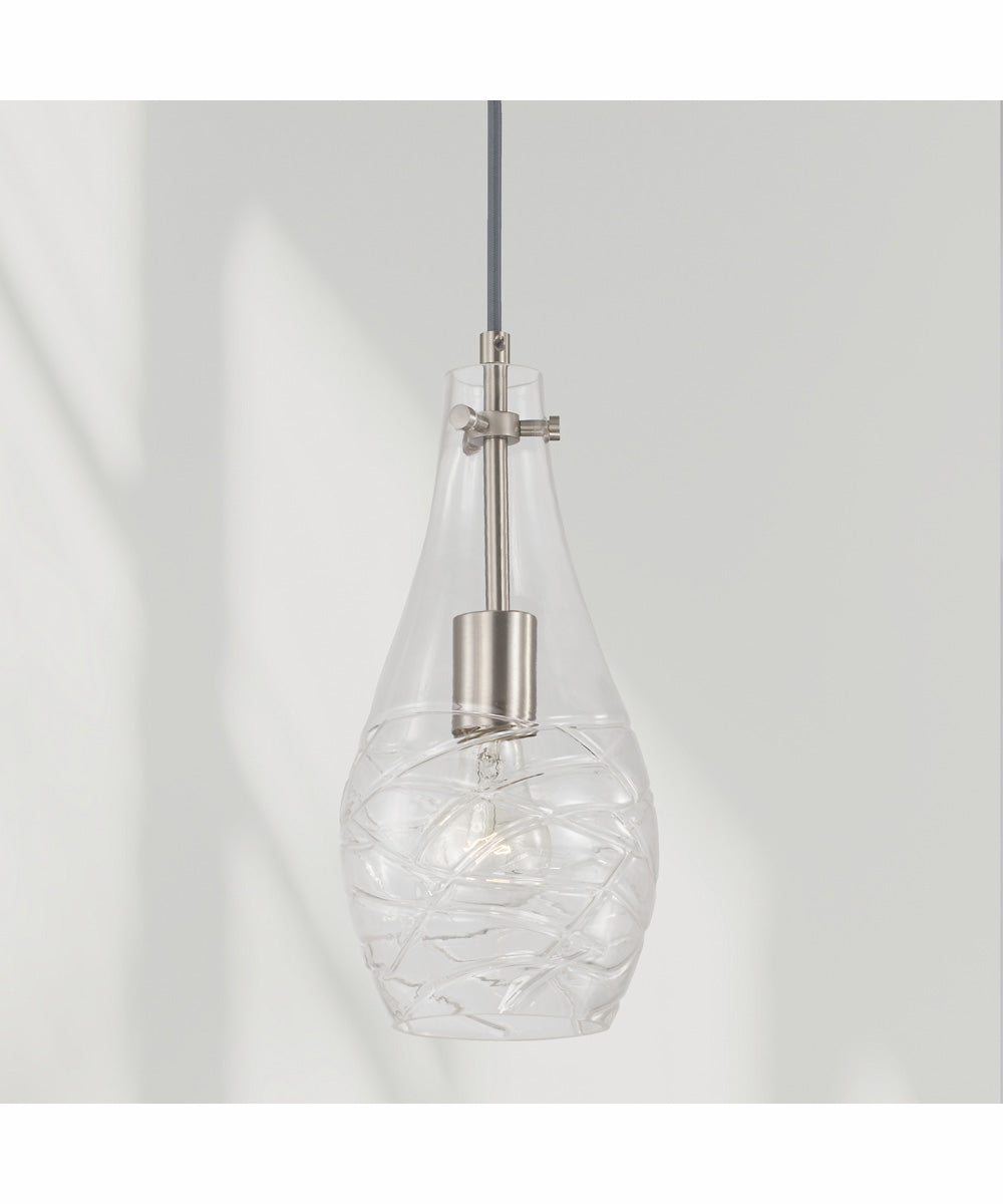 Sleek and stylish, the Kier 1-Light Pendant in Brushed Nickel is a perfect blend of modern elegance and timeless design. This pendant light features a teardrop-shaped clear embossed glass shade that adds a touch of texture and sophistication to any space. The wavy etched detailing on the bottom of the glass creates a captivating visual effect, making it a standout piece in your home decor.