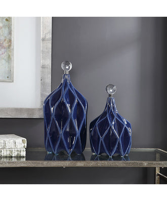 Modern Style Emanates From This Set Of Decorative Ceramic Bottles With An Embossed Geometric Pattern Finished In A Glossy Cobalt Blue And Accented With Polished Nickel And Crystal Finials. Sizes: Sm-8x13x8, Lg-8x17x8Uttermost's Decorative Bottles & Canisters Combine Premium Quality Materials With Unique High-style Design.With The Advanced Product Engineering And Packaging Reinforcement, Uttermost Maintains Some Of The Lowest Damage Rates In The Industry. Each Product Is Designed, Manufactured And Packaged With Shipping In Mind.