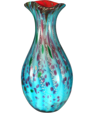 The soothing colors of our Lagood Vase will add easy design flair to your home or office. This stately urn vase features a base blend of sky blue that is accented with delicate multicolored drops and swirls throughout. The inside of the vase is a vivid red with gold swirls. Lagood's height, gently tapered neck, and delicately ruffled mouth are all designed to accommodate even the tallest of your favorite blooms, making it a delightful centerpiece on a larger dining, console or entryway table. No matter where you choose to display it, our Lagood Vase will provide a dramatic accent to any decor.