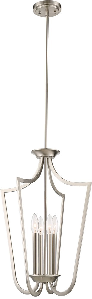 The 14"W Laguna 4-Light Pendant in Brushed Nickel by Nuvo Lighting is a perfect blend of contemporary elegance and modern design. Its sleek brushed nickel finish adds a touch of sophistication, making it an ideal centerpiece for any room. The pendant features a unique caged design that encases four candelabra-style lights, creating a striking visual appeal. With its clean lines and minimalist aesthetic, this pendant light complements various interior decor styles, from modern to transitional.