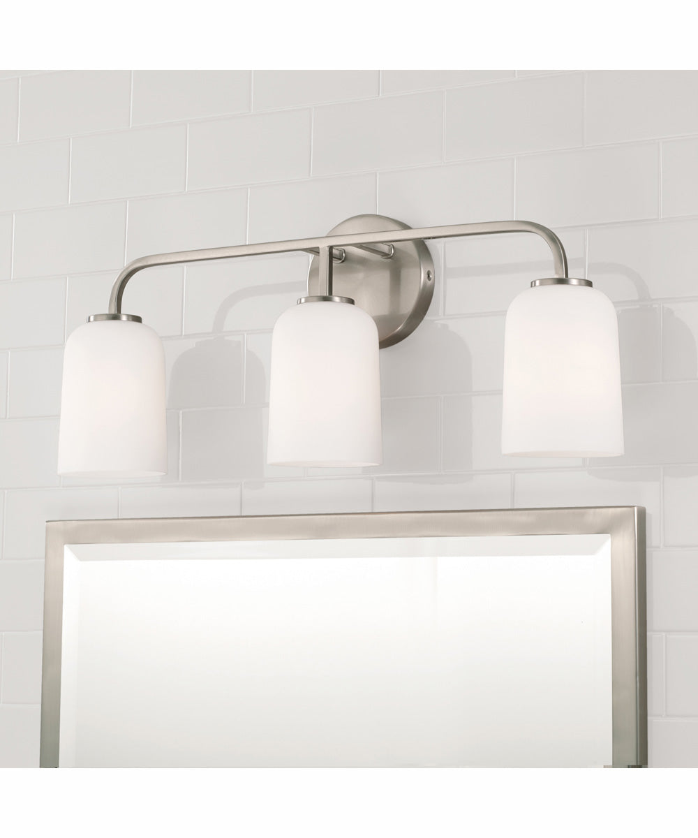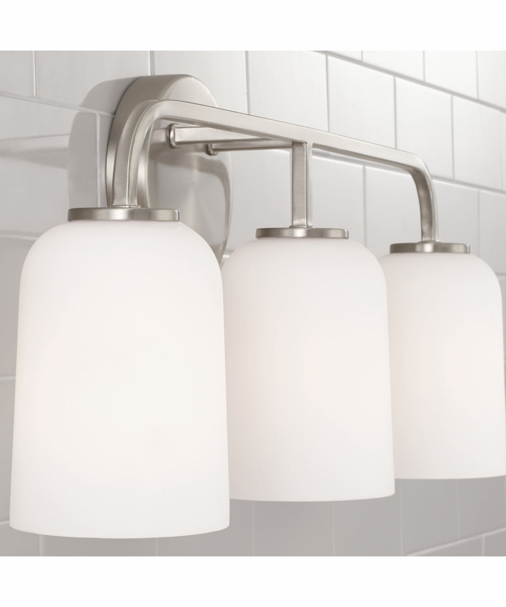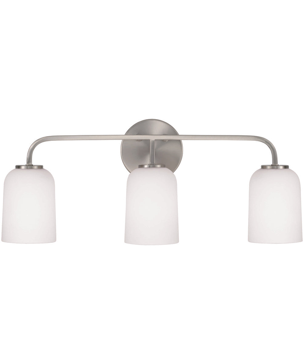 With soft contours and arched shades, the Lawson 3-Light Vanity for HomePlace brings curve appeal to any space. The Brushed Nickel finish and soft white glass create a classic aesthetic that mixes with any style. Also available in a 2-Light or 4-Light.