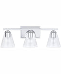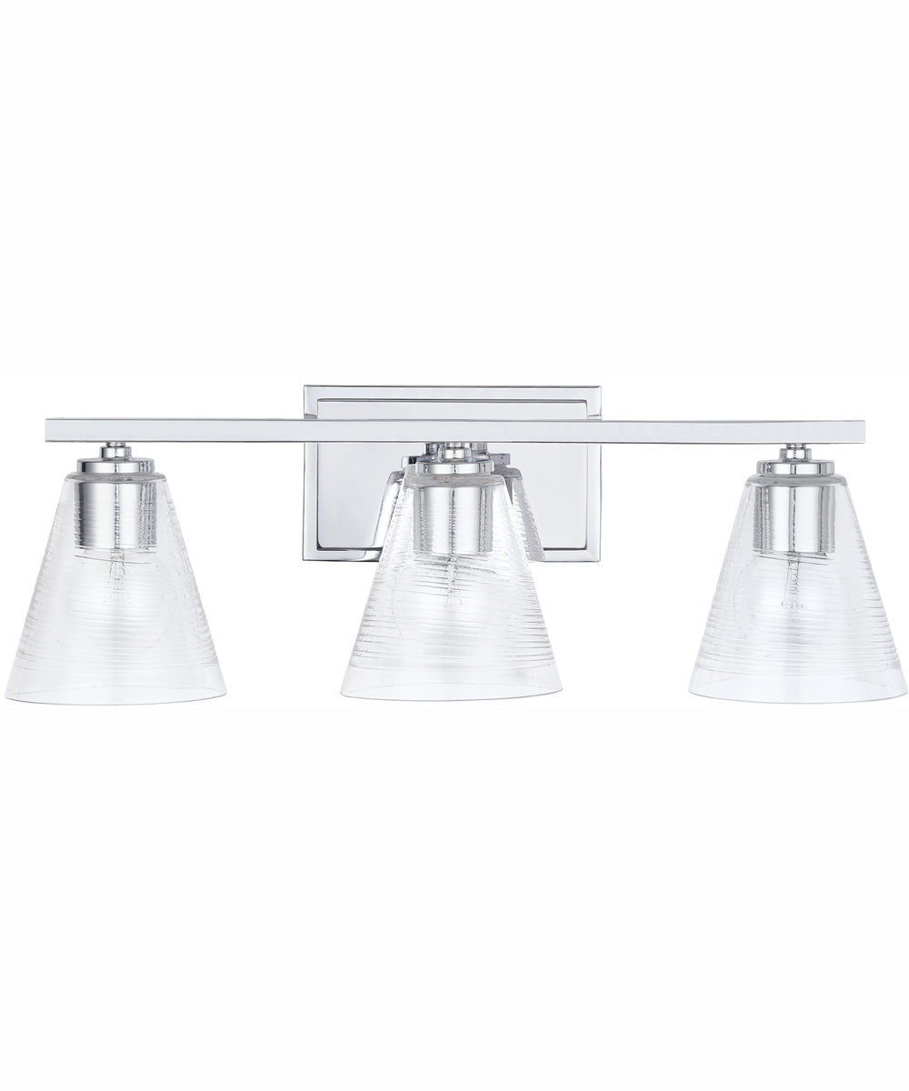 The cone-shaped glass on this 3-Light Vanity has a raised glass spiral texture on the exterior of the material, creating a unique texture and sparkle that is further emphasized by the Chrome finish.