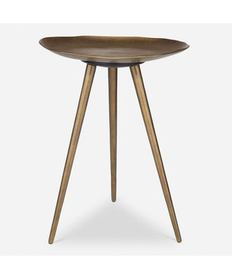 This unique accent table is made from cast aluminum in an antique brass finish. the three slender legs extending outward give the table its sturdy tripod base supporting the lily pad shape top.