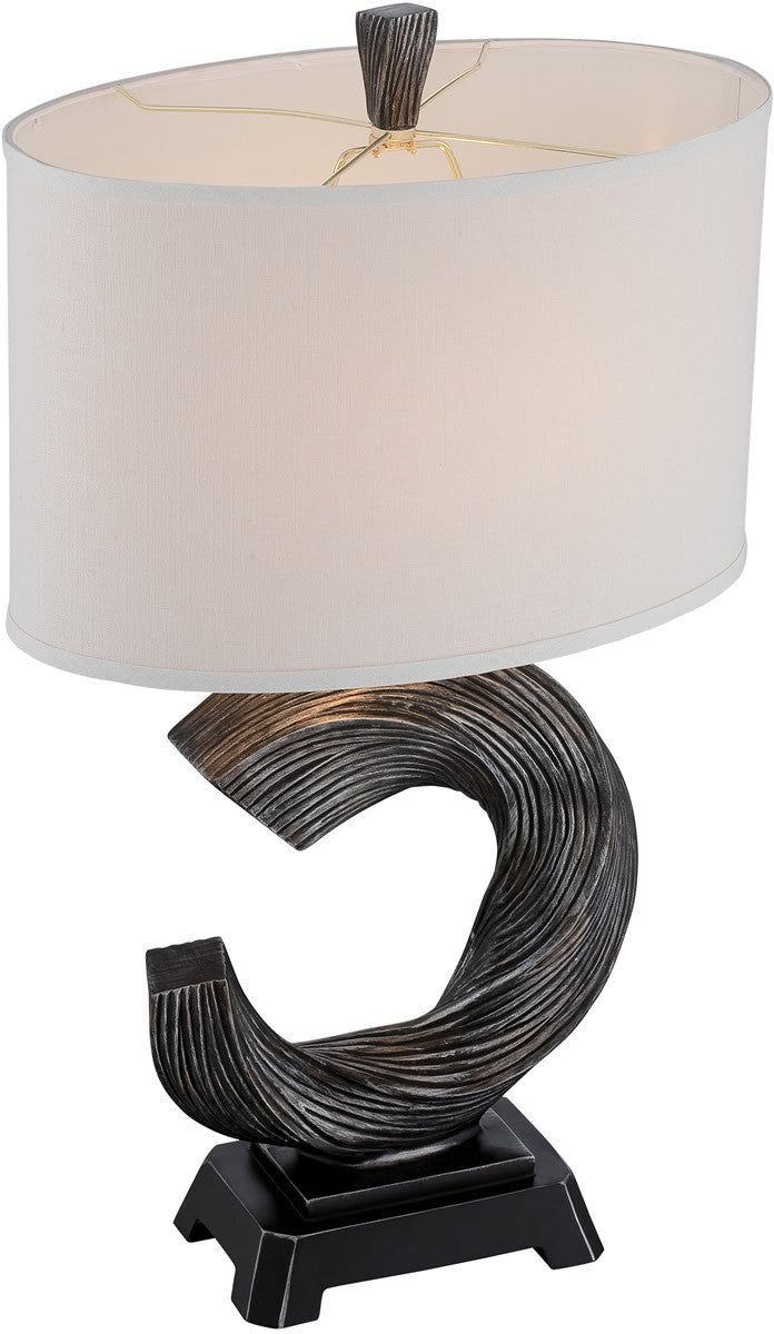 This transitional table lamp showcases an antique patina finished, sculptural designed body. Complete with an elliptical linen fabric shade, this artful lamp can enhance your bedroom, living room or office.