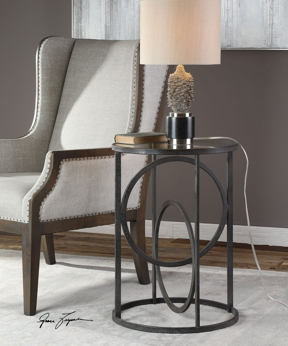 Interlocking Loops Of Chunky Hand Forged Iron Finished In A Textured Aged Black With Gold Highlights. Top Is Clear Glass.Uttermost's Accent Tables Combine Premium Quality Materials With Unique High-style Design.With The Advanced Product Engineering And Packaging Reinforcement, Uttermost Maintains Some Of The Lowest Damage Rates In The Industry. Each Product Is Designed, Manufactured And Packaged With Shipping In Mind.