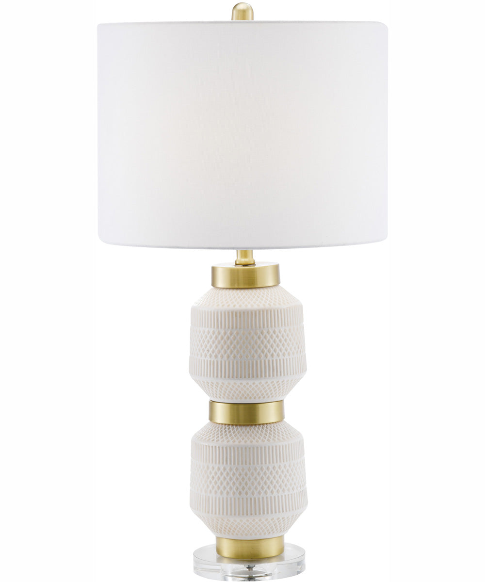 The Madelia Table Lamp boasts a beautiful white finish that enhances its clean and modern aesthetic. The ceramic base is adorned with a subtle yet intricate pattern, giving it a unique and stylish appearance. The antique brass accents add a warm and luxurious touch, making this lamp a perfect blend of contemporary and classic design elements. The white linen shade completes the look, providing a neutral and versatile color that can easily blend with various interior styles.