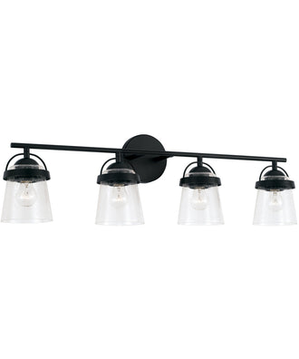 Chic curves and clean lines create the Madison 4-Light Vanity for Homeplace. The Matte Black finish adds dimension and accents the seeded glass for standout style. Also available in 2-Light and 3-Light.