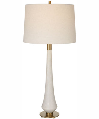 • Features: This table lamp adds an air of elegance and sophistication to any space. the body of the lamp is crafted from ivory man-made stone that accurately replicates the look of thassos marble and is accented by iron details finished in brushed brass.