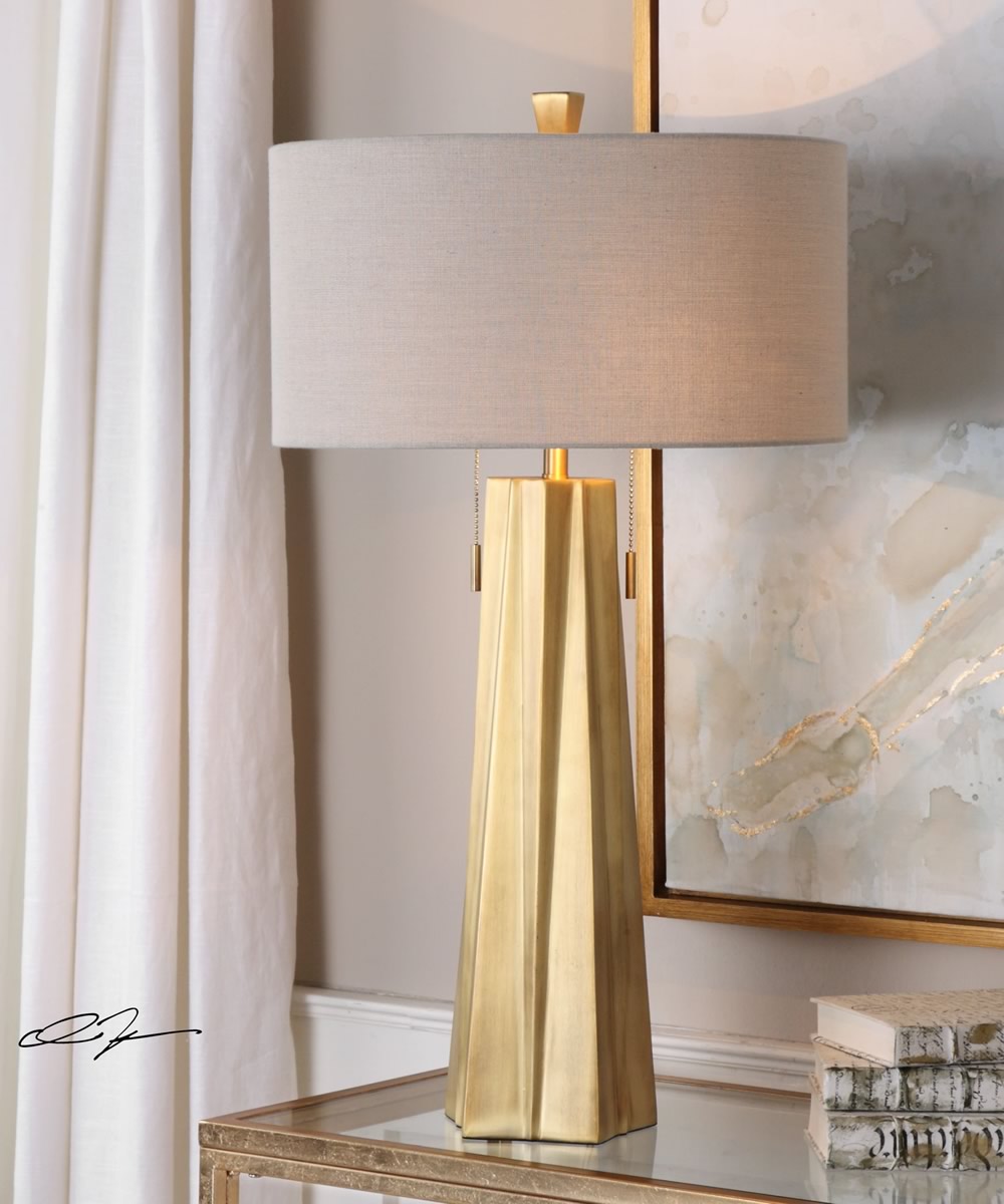 Shaped Steel, Molded Into An Inverted Star Pattern, Finished In A Plated Antiqued Brass. The Round Hardback Drum Shade Is A Light Beige Linen Fabric.Uttermost's Lamps Combine Premium Quality Materials With Unique High-style Design.With The Advanced Product Engineering And Packaging Reinforcement, Uttermost Maintains Some Of The Lowest Damage Rates In The Industry. Each Product Is Designed, Manufactured And Packaged With Shipping In Mind.