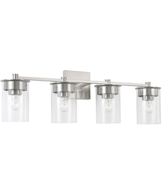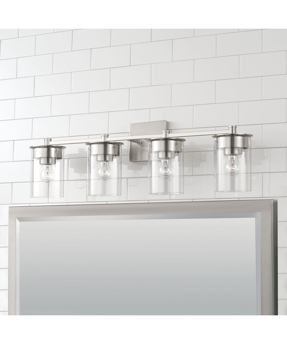 The Mason 4-Light Vanity in Brushed Nickel is a stunning addition to any modern bathroom. With its clean lines and contemporary design, this vanity light fixture exudes sophistication and elegance. The brushed nickel finish adds a touch of warmth and complements the sleek, minimalist aesthetic. The clear glass shades encase each bulb, providing a beautiful and even distribution of light that enhances the overall ambiance of your space.