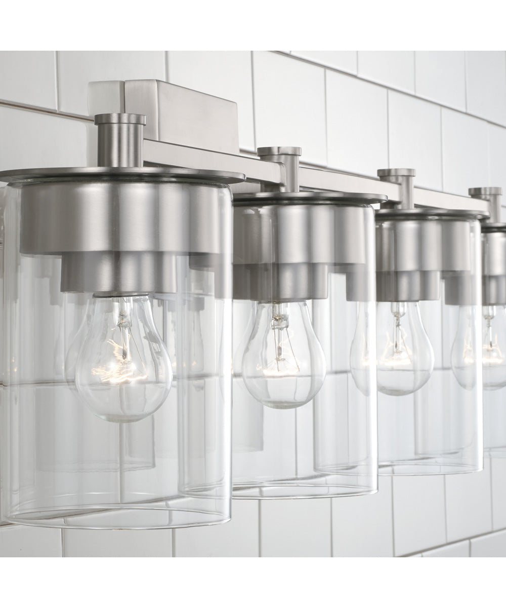 The Mason 4-Light Vanity is ideal for a variety of bathroom styles, from contemporary to transitional. Its versatile design makes it suitable for placement above single or double vanities, providing optimal lighting for tasks such as shaving, makeup application, and general grooming. The brushed nickel finish pairs well with a range of bathroom fixtures and accessories, making it easy to integrate into your existing decor. Whether you have a modern, minimalist bathroom or a more traditional space, this vanity light will enhance the look and feel of your room.