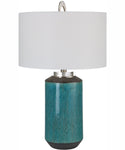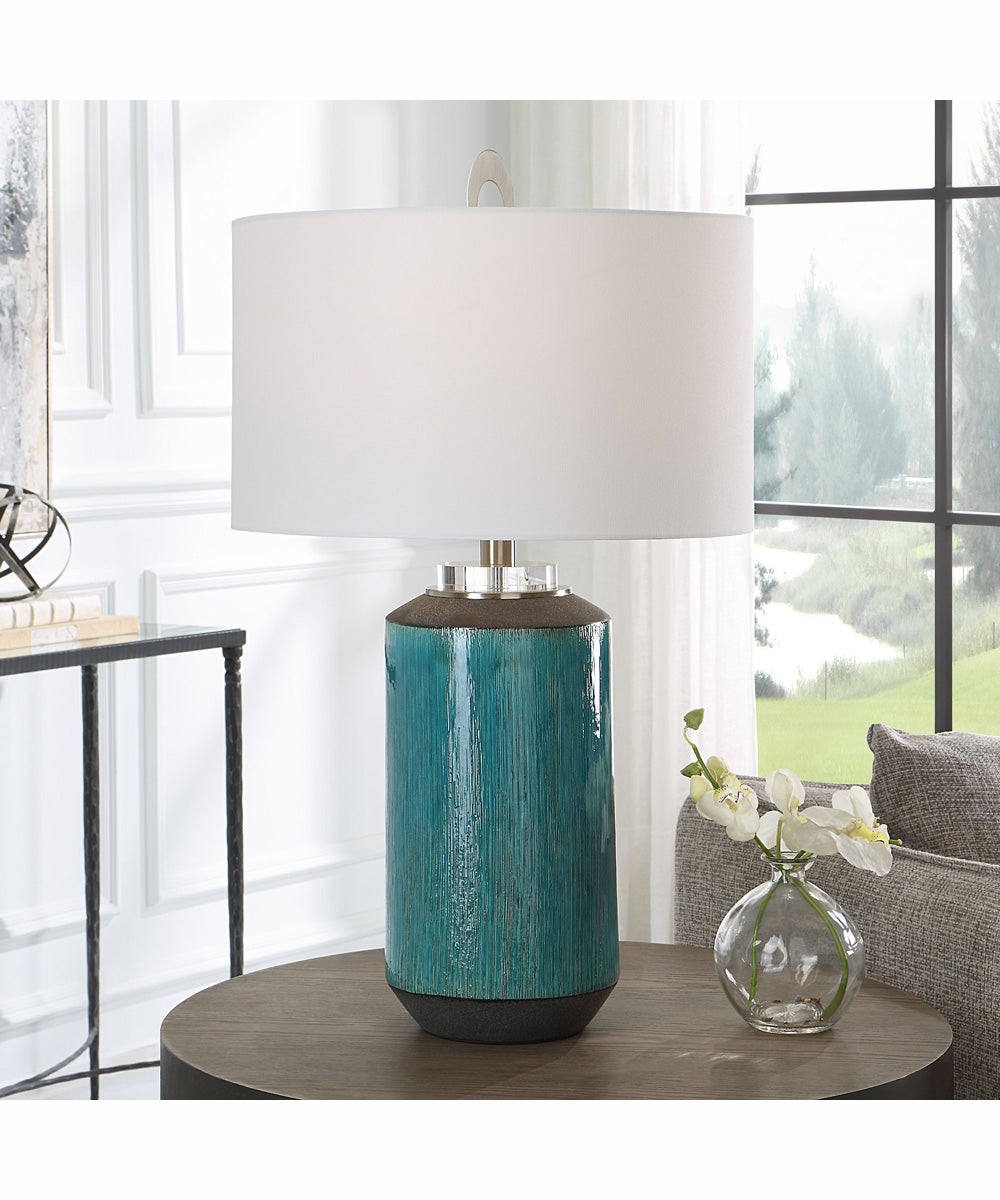 • Features: Handcrafted by talented artisans, this ceramic lamp features a lightly distressed, high gloss, aqua blue glaze paired with matte bronze edges and crystal details.