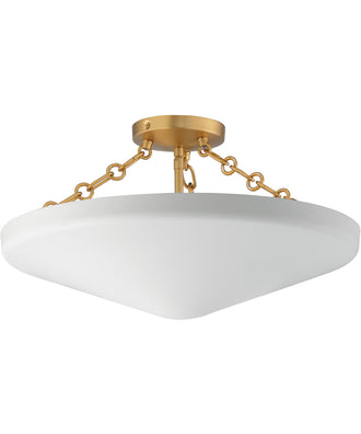 An inverted steel cone vessel painted in textured Plaster White gesso provides ambient lighting with classical styling. The stylized ring and oval chain links in Natural Aged Brass compliment the overall design. Available in two sizes of pendants and flush mount.