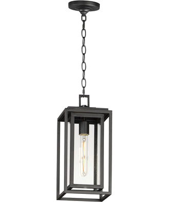 The Cabana 1-Light Outdoor Hanging Pendant in Black is a stunning addition to any outdoor space, combining contemporary design with transitional elements for a versatile and stylish look. This pendant light features a dual-framed structure that adds depth and dimension, making it a standout piece in your outdoor decor. The frames are crafted from square tubing and squared components, giving it a sleek and modern appearance.