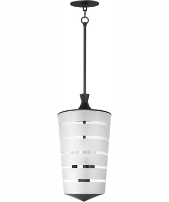 The Copacabana 3-Light Pendant in black is a stunning blend of vintage charm and modern elegance. This pendant light features a playful grouping of globe and tapered cylinder glass shades, each adorned with a distinctive striped pattern. The wide stripes of etched glass are interspersed with thinner clear glass lines, creating a unique and approachable design that softens the light source beautifully.