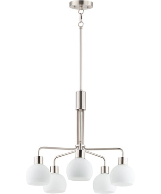 The Coraline 5-Light Chandelier in Satin Nickel is a stunning addition to any home, combining both traditional and modern aesthetics. This chandelier features five beautifully crafted Satin White glass domes that are suspended from individually distributed tube arms. The sleek Satin Nickel finish provides a sophisticated touch, making it an ideal centerpiece for various interior design themes.