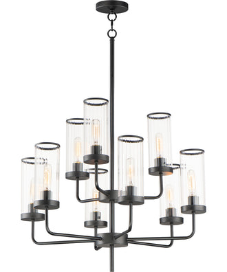 The Crosby 9-Light Chandelier in Black is a stunning blend of simplicity and contemporary design. With its sleek matte black finish, this chandelier exudes a modern elegance that complements any interior decor. The minimalist structure features clean lines and an open frame, making it a versatile addition to various room styles. The clear ribbed glass shades add a touch of sophistication, diffusing light beautifully and creating a warm, inviting ambiance.