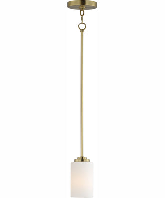 The Deven 1-Light Mini Pendant in Satin Brass is a stunning addition to any space, offering a sleek and modern design that effortlessly blends with various interior styles. The pendant features low sloping arms made of rectilinear tubing, finished in a contemporary Satin Brass that adds a touch of sophistication and luxury to your decor. The tall, cylindrical Satin White glass shade softens the light source within, creating a warm and inviting ambiance.