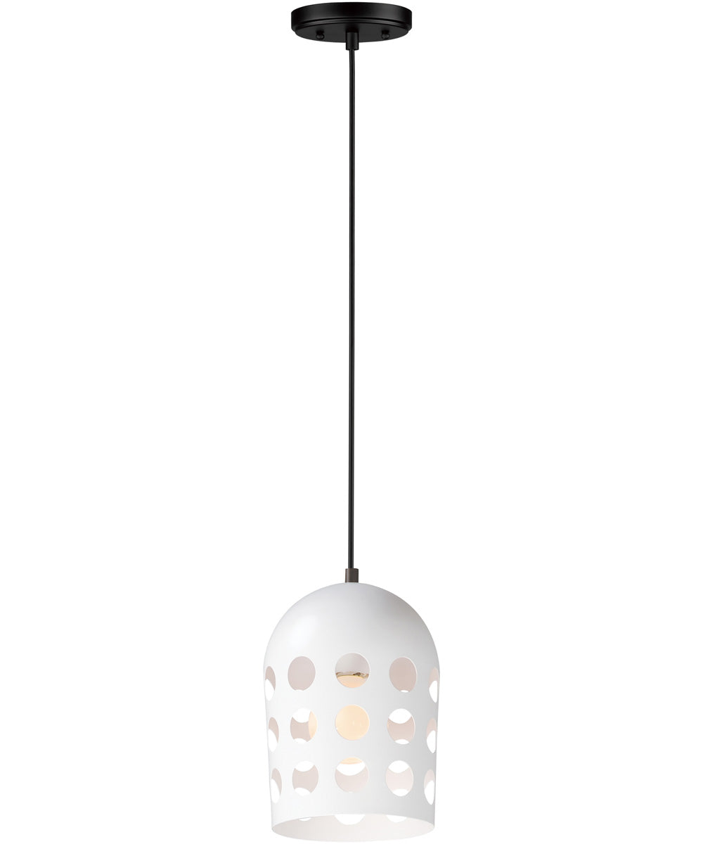Retro configurations of Mid-Century Modern perforated metal designs inspire this collection of pendants, wall and ceiling mounts complete in a two tone powder coat finish. The spun metal shades are punched with large circular perforations that scatter a pattern of light when lit. Finished in a clean, two-tone Matte White and Black powder coat, these pieces add cheerful character to their space. The oversized shades on the wall sconce and portable lamps also feature a swivel joint that allow you to position the shade and direct the light with ease. A convenient switch on the back of the shade operates a 3-step dimmer to adjust the lamp's brightness at the touch of a button.