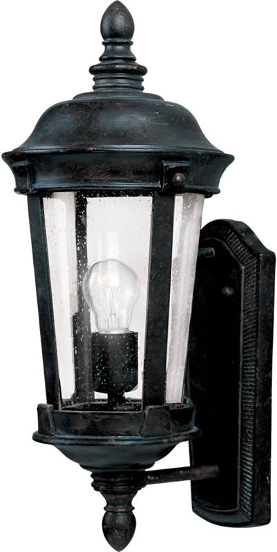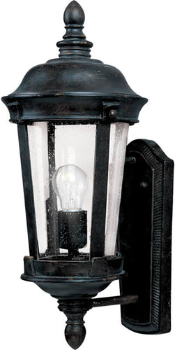 The 17"H Dover Cast 1-Light Outdoor Wall Mount in Bronze is a stunning addition to any exterior space. This fixture boasts a traditional Mediterranean design that exudes elegance and sophistication. The bronze finish adds a touch of timeless charm, making it a perfect fit for both classic and contemporary settings. The lamp features seedy glass panels that not only enhance its aesthetic appeal but also create a warm, inviting glow when illuminated.
