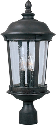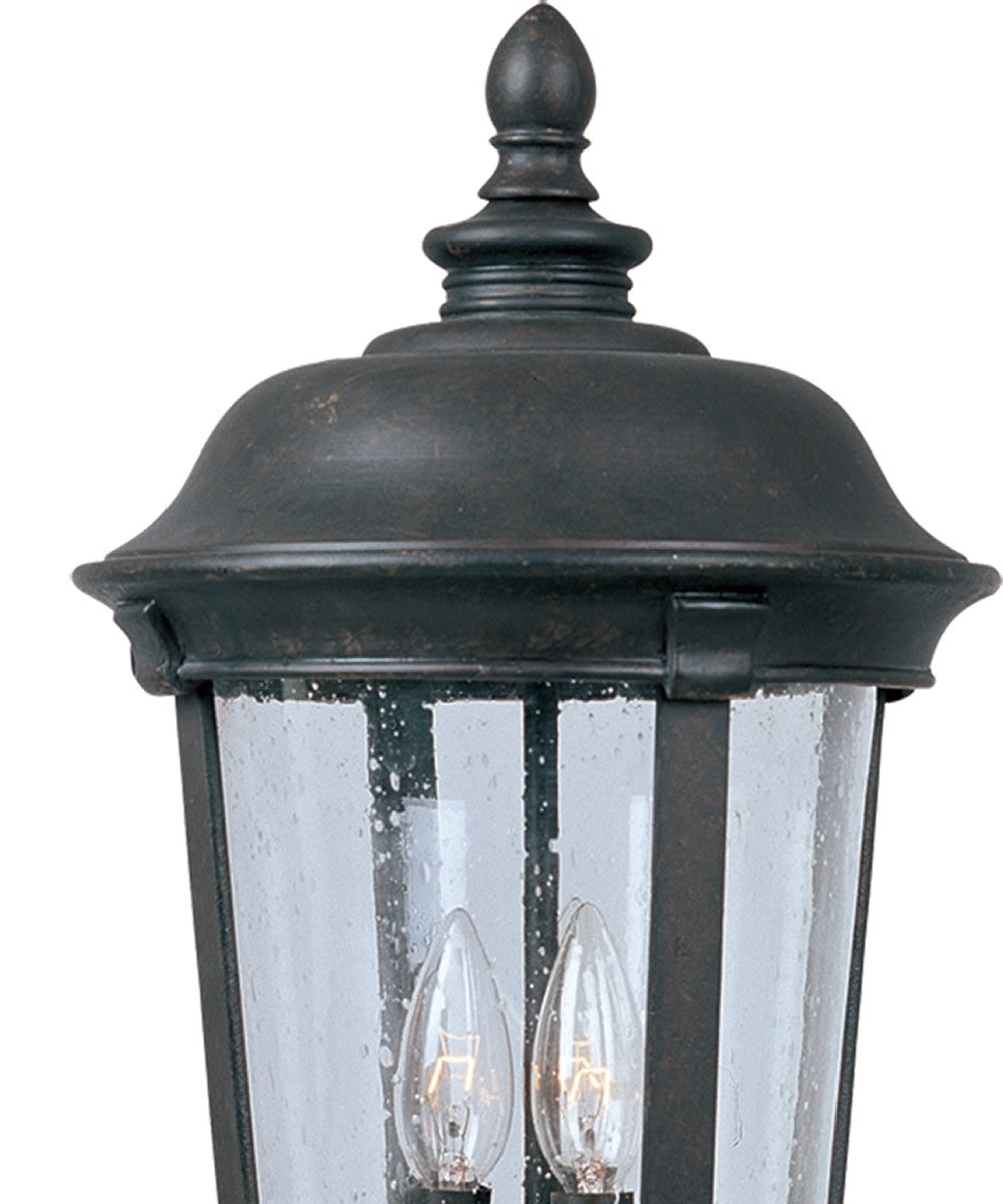The 21" Dover Cast 3-Light Outdoor Pole/Post Mount in Bronze is a sophisticated lighting solution that brings a touch of traditional Mediterranean style to your outdoor spaces. This exquisite fixture, part of the renowned Dover Cast Collection by Maxim Lighting International, features a rich bronze finish that exudes a sense of timeless elegance. The seedy glass panels add a charming, vintage appeal, creating a warm and inviting ambiance for your garden, driveway, or patio.