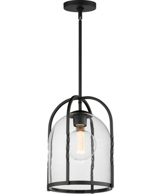 The Foundry 1-Light Pendant in Black is a stunning addition to any space, combining modern design with timeless elegance. This pendant light features forged iron spindles that twist gracefully along the frame, creating a captivating visual appeal. The half-round sconce is finished in a neutral black outdoor-rated powder coat, ensuring durability and resistance to the elements. The clear seeded glass shade adds a touch of vintage charm, making it a versatile piece that complements various interior styles.