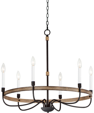 The Franklin 6-Light Chandelier in Driftwood and Black finish is a stunning blend of rustic charm and elegant simplicity. This chandelier features a warm, distressed wood finish that exudes a cozy, inviting atmosphere. The textured black metal arms add a touch of industrial sophistication, making it a versatile piece that can complement both classic and transitional decor styles. The white candle covers mimic the look of wax candles, enhancing the chandelier's timeless appeal.