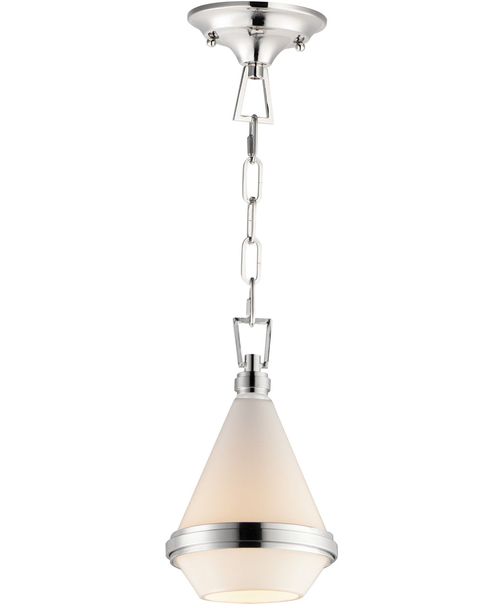 The Giza Mini Pendant in Polished Nickel is a stunning addition to any modern home. This pendant light features a simple yet elegant glossy white glass shade that is conical in form, offering a sleek and sophisticated look. The sharp lines of machined steel bands finished in polished nickel create a pyramid of softly diffused light, adding a touch of luxury to your space.