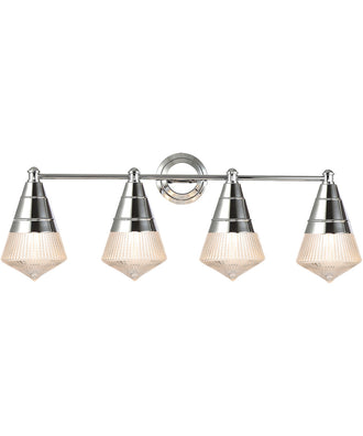 A prismatic diffusion of light is housed within pressed cone glass shades. Choose from pendants with tapered metal halves that conceal the light source or glass shades that are supported by a metal ring. Coordinating bath vanity lights complete the collection.