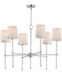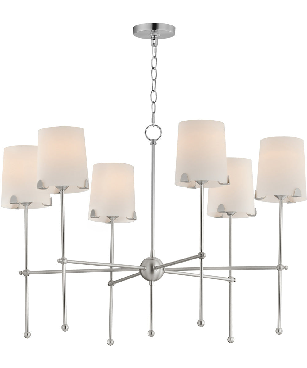 Satin White shades taper in a classic fabric shade shape and rest on elegantly thin frames of Satin Brass or Satin Nickel. They are supported secured by a mostly concealed structure with coordinating semicircular tabs that complement the spherical joints of the frame. The modern design details and updated shade materials refresh the outlook of a timeless chandelier though its use of thoughtful features.