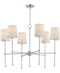 The Huntington 6-Light Chandelier in Satin Nickel is a stunning blend of modern design and timeless elegance. This chandelier features six Satin White shades that taper into a classic fabric shade shape, resting gracefully on slender frames of Satin Nickel. The shades are supported by a mostly concealed structure, with coordinating semicircular tabs that complement the spherical joints of the frame. The sleek, contemporary design details and updated shade materials breathe new life into the traditional chandelier, making it a perfect centerpiece for any room.