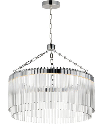 Clear glass rods elegantly curve to drape over a metal frame, encasing an integrated LED light source within. These ornamental glass rods form a luminous curtain, softly illuminated by the LEDs. The LED light source features an adjustable color temperature, allowing you to effortlessly switch between warm 2700K, neutral 3200K, and cool 4000K settings to suit any ambiance. Suspended by intricately designed chain links, the jewel-like glass skirt adds a touch of sophistication and refinement. Choose from two stunning frame finishes: Natural Aged Brass or Polished Nickel.