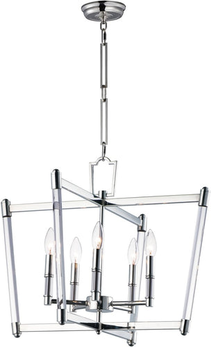 The 19"W Lucent 5-Light Chandelier in Polished Nickel is a stunning piece that effortlessly combines modern aesthetics with classical elegance. Its unique design features solid clear glass rods meticulously fitted into polished nickel castings, creating a look that is both striking and sophisticated. The chandelier's geometric structure, with its clean lines and transparent elements, adds a touch of contemporary flair while maintaining a timeless appeal.