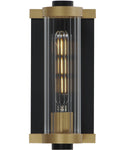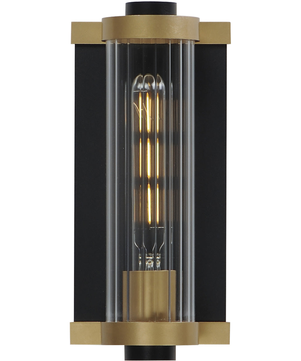Internally ribbed clear glass tubes refract tubular lamps, creating a shimmering light effect. The glass is supported by a two-tone black frame with Aged Brass accents, making this sconce suitable for both indoor and outdoor installations. With a depth of less than 4 inches, this ADA compliant sconce may also be used in commercial applications. .