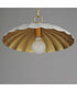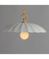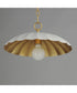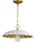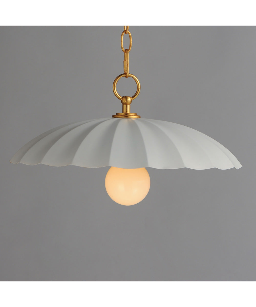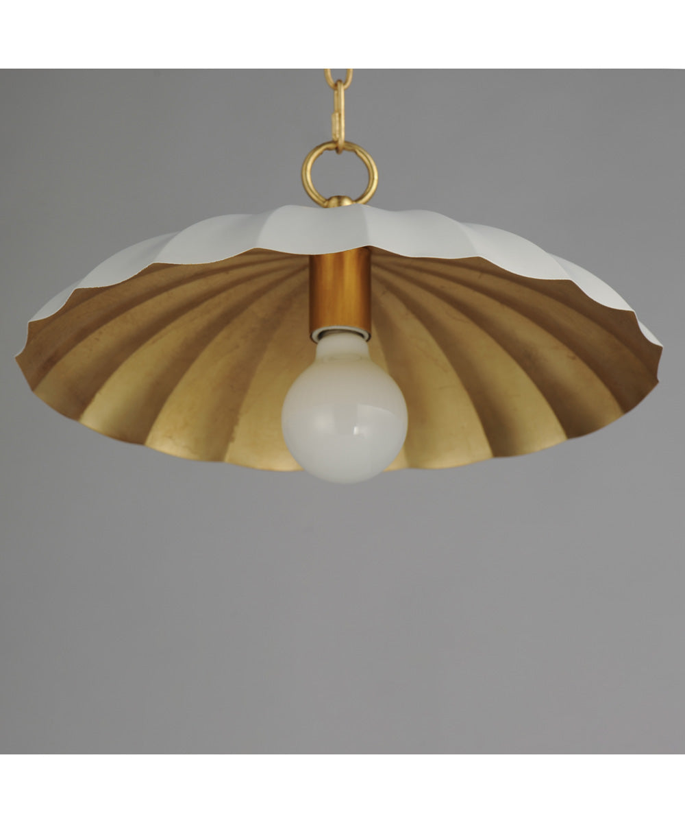 The Primrose 1-Light Pendant in Matte White and Gold Leaf finish is a stunning addition to any home. Featuring a scalloped metal shade with a hand-applied gold leaf interior, this pendant light exudes a nostalgic charm reminiscent of classic designs. The unique scallop detailing adds an elegant touch, making it a perfect statement piece for various room decors.