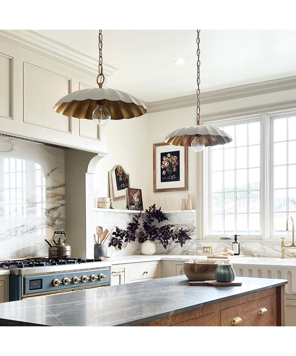 The timeless design of the Primrose pendant light makes it suitable for a variety of room themes. Its matte white finish with gold leaf accents complements both modern and traditional decor styles. It works well in minimalist settings, adding a touch of elegance without overpowering the space. In more ornate or vintage-inspired rooms, it enhances the overall aesthetic with its classic charm.