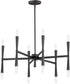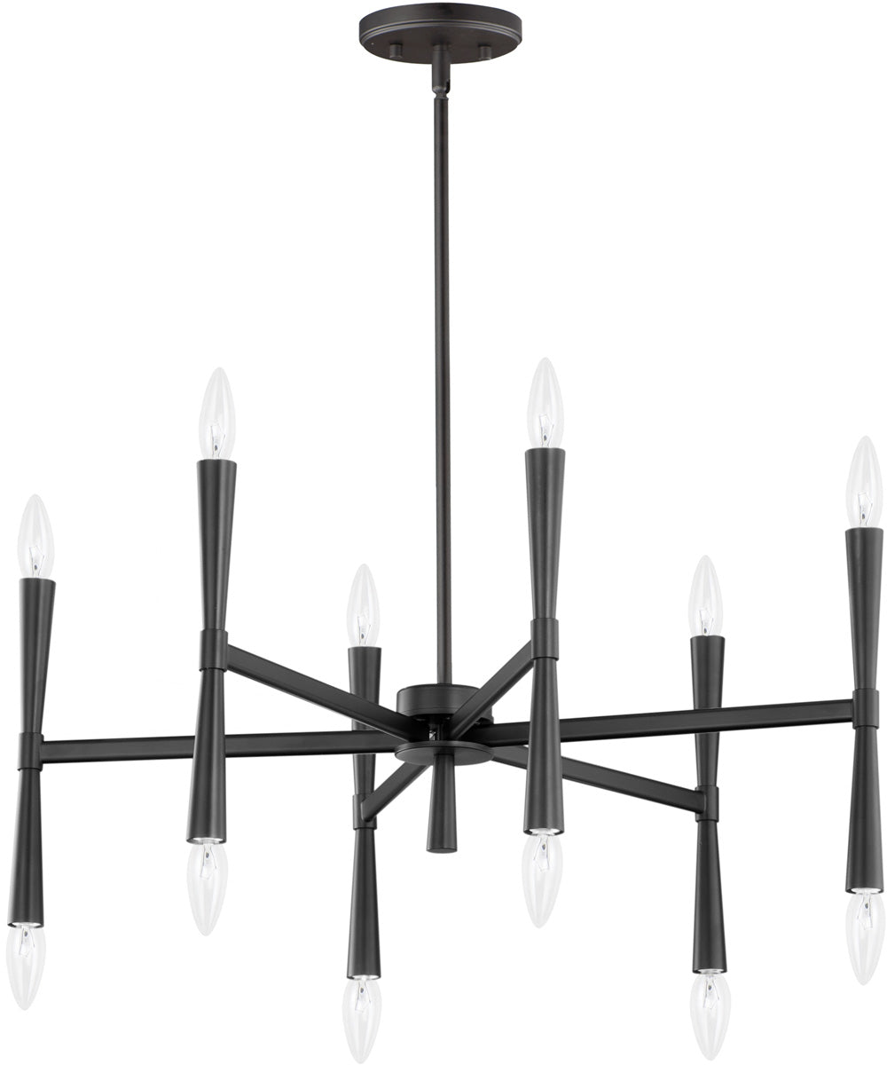 The Rome 12-Light Chandelier in Black is a stunning piece that effortlessly combines modern elegance with classic charm. Its design features straight rectilinear channels radiating from a central connector, creating a sophisticated and balanced look. The light sources flare out both up and down with tapered candle covers, reminiscent of a classic torch, adding a timeless touch to any space.