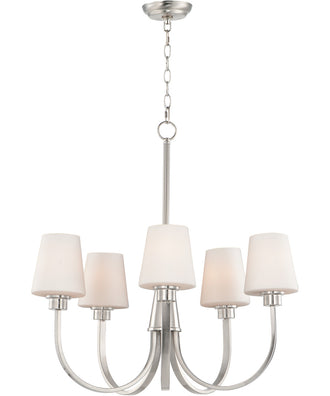 The 27"W Shelter 5-Light Chandelier in Satin Nickel is a stunning centerpiece that combines graceful design with modern aesthetics. Its elegant arcs of rectangular tubing transition seamlessly into round cups, supporting tapered Satin White glass shades. This harmonious blend of shapes creates a crisp and clean transitional design that is both sophisticated and versatile. The Satin Nickel finish adds a touch of contemporary elegance, making this chandelier a perfect addition to any room.