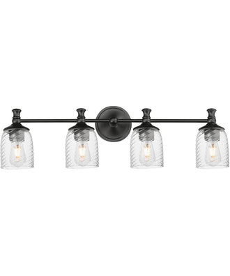 Traditional bell glass shades are reimagined with a swirling and fluted pattern. These Clear Ribbed glass shades are combined with traditional elements on the frame that complete the design. Available in Polished Nickel, Antique Bronze, or Satin Champagne finishes.