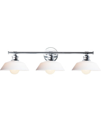 Satin White cased glass shades in an RLM shape are mounted to a nostalgic Polished Chrome frame to create this clean and classic look. The larger scale glass sets this look apart and makes a statement over the vanity.