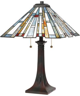 The Maybeck Small 2-light Table Lamp in Valiant Bronze is a chic interpretation of timeless Tiffany style. Its classic tapered silhouette features a staggered edge that emphasizes the intricate details of the multicolor Tiffany glass shade. The lamp stands at 24.75 inches in height, with a shade measuring 16 inches in width and depth, making it a perfect size for various spaces within your home.