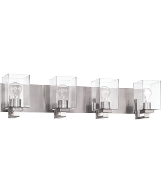 From the wide rectangular backplate to the custom square clear glass shades, the sharp design of the McClane collection was designed with your style in mind. Offered in two finishes, the McClane is available in a 1 light wall sconce up to a four light vanity. Tubular bulb(s) recommended. Bulbs not included.